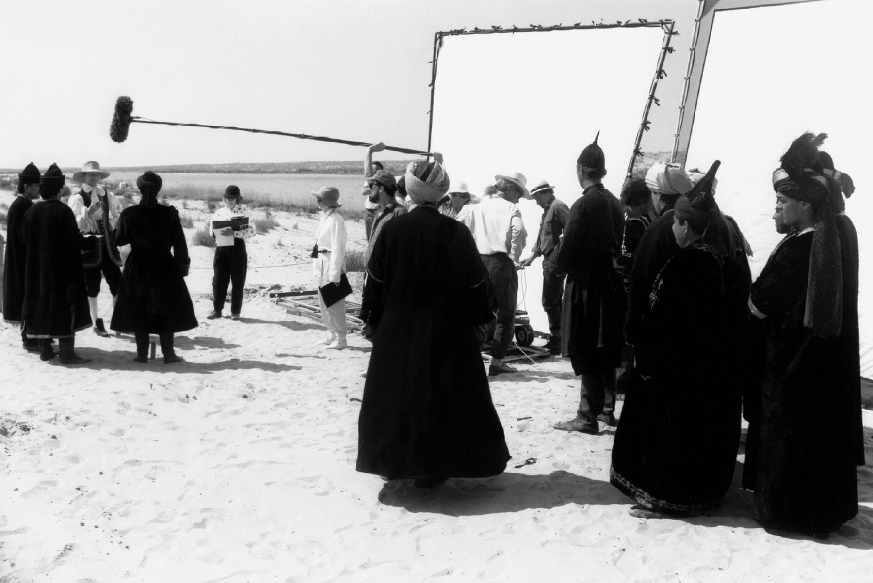 Shooting the desert banquet with Tilda Swinton and Lothaire Bluteau in Khiva, Uzbekistan. Sally Potter is with the script supervisor, Penny Eyles, and a hard-grating crew.